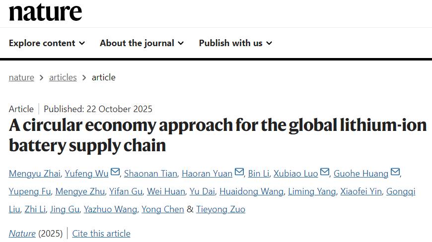 2025年10月23日,国际顶级学术期刊《Nature》发表了题为“A circular economy approach for the global lithium-ion battery supply chain”(全球锂离子电池供应链的循环经济分析)的研究论文。